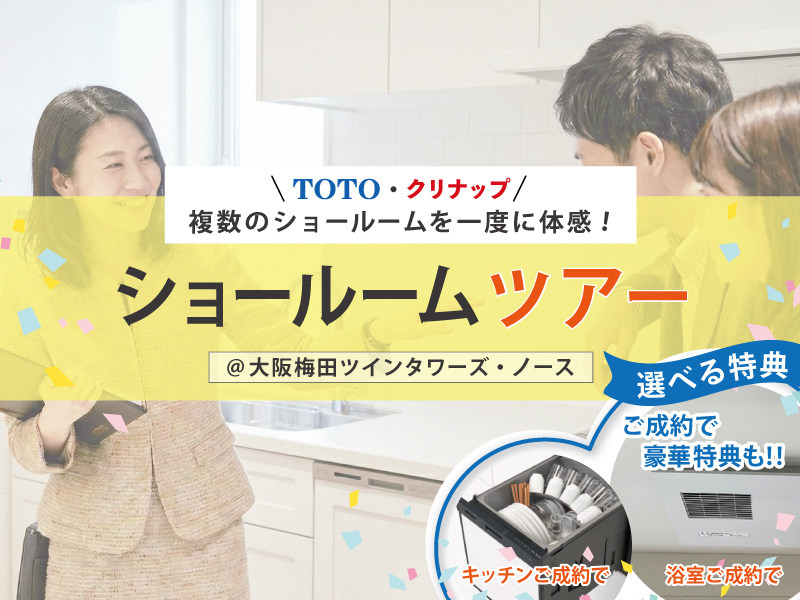 TOTOとクリナップの大阪梅田ショールームを知識豊富な担当が一緒に同行するツアーを開催!2つのショールームで実際の商品を見ながら比較・具体的なご相談やアドバイスも可能です。