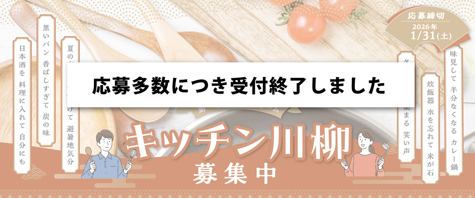 料理中のひとコマ、家事の工夫、家族とのやり取りなど、キッチンにまつわる出来事を川柳形式で自由にお寄せください。