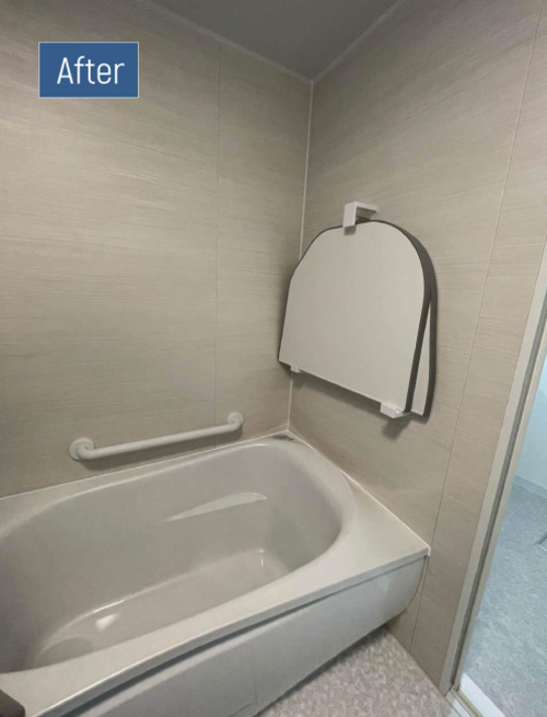 元のお風呂ではカビが気になるとのことでしたが、WYはパネルの継ぎ目にシリコンを使用しない構造のため、お手入れ面でも安心です。将来の使いやすさも考慮し、浴槽横には手すりを、シャワーまわりにはフックとしても使えるスライドバーを設置しました。