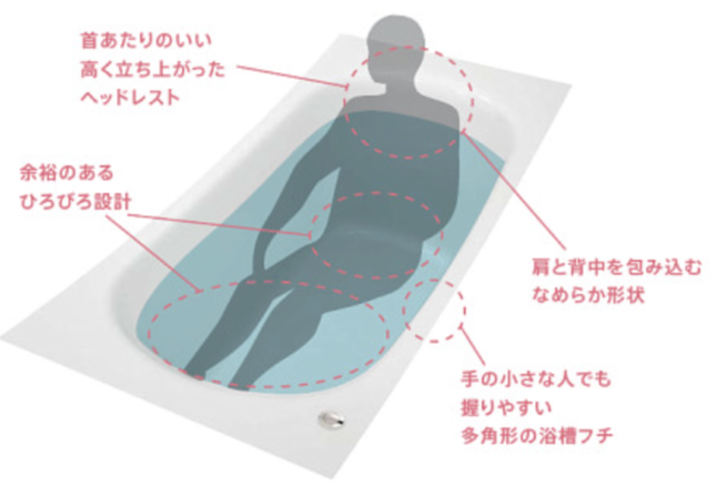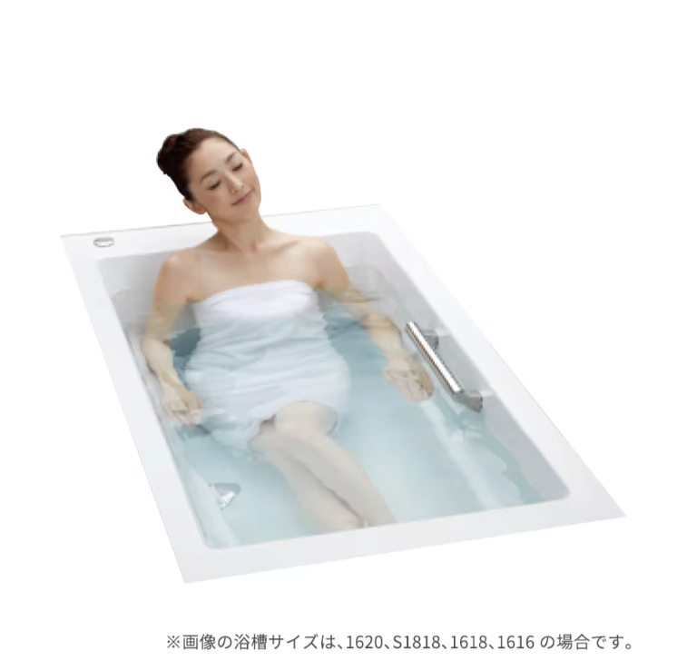 湯船の中で姿勢を安定させながら入浴できるため、従来の「肩まで一気に浸かる」だけの入浴よりも、体に負担をかけず、じっくり湯に浸かれるのが特徴。
