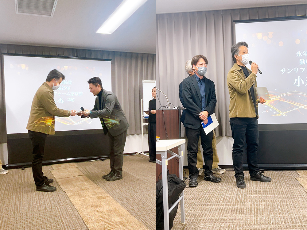 半期表彰の発表では、仲間の受賞に社員全員が温かい拍手を送り、喜びを共有しました。受賞者からは、日頃支えてくれる先輩や同僚への感謝、そしてリフォームへの強い情熱が語られ、日々の取り組みを改めて実感できる大切な時間となりました。