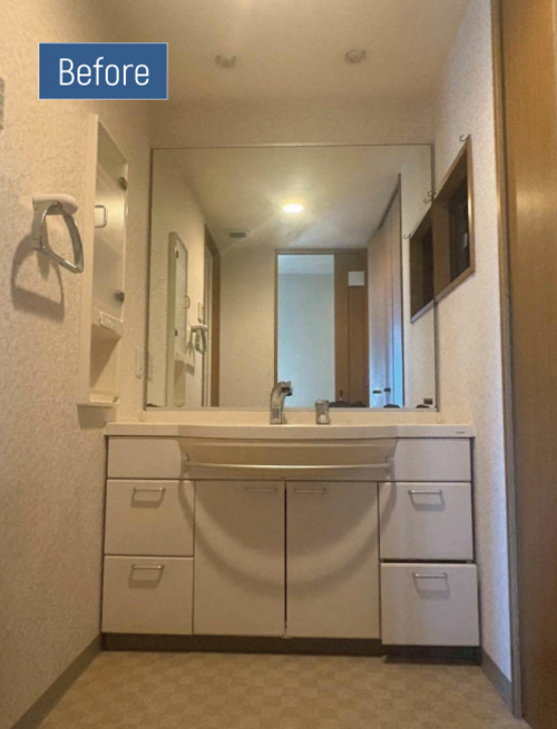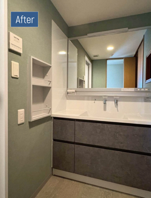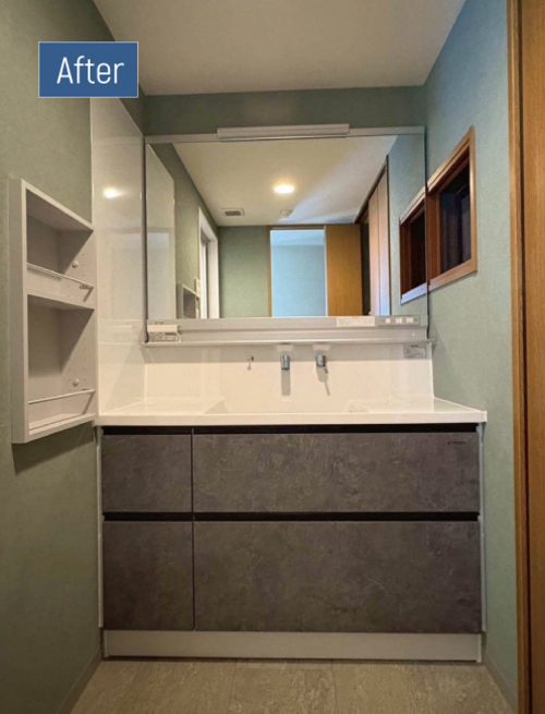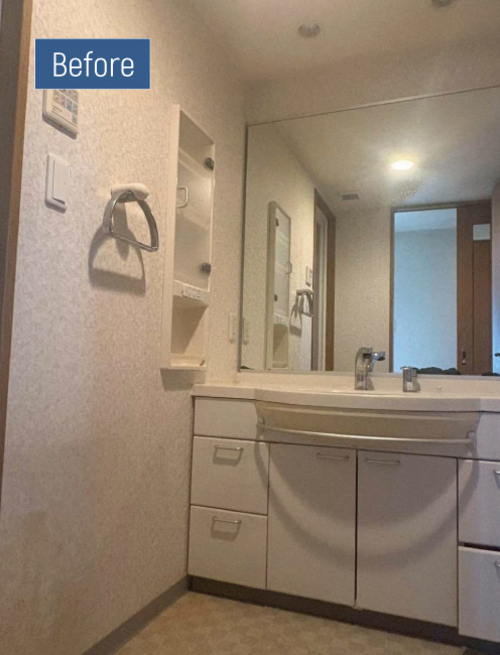ご家族の介護をきっかけに、今後の使い勝手を考慮したリフォームをご希望されました。洗面所横の埋め込み収納については、今後置かれる予定の物の寸法やコンセントの位置などを丁寧にヒアリングし、使いやすさを重視した設置を行いました。