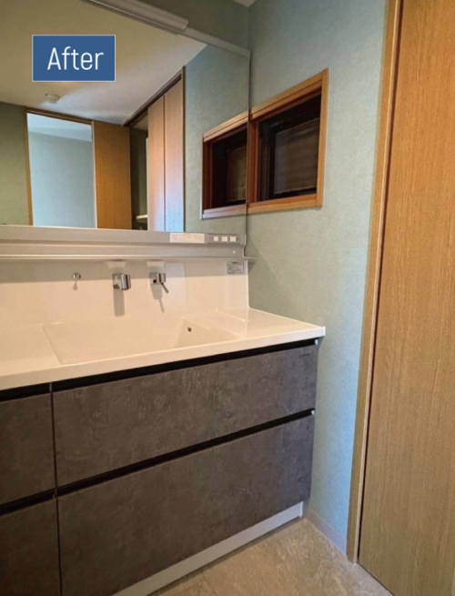 また、全体的に清掃性を気にされていたため、壁紙には汚れにくくマンションにも適した仕様をご提案。床材については、既存のクッションフロアのへこみが気になるとのことで、傷や汚れに強いフロアタイルをご提案しました。内装は洗面台の色味と調和しており、特に床材について「この床にしてよかった」とのお言葉をいただきました。