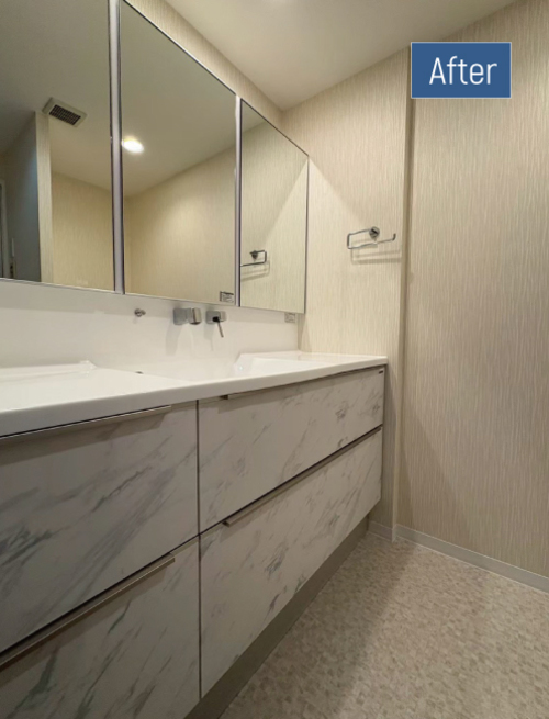リフォーム後はお手入れの負担が軽減され、特に洗面台は上部から立ち上がるタイプの水栓にしたことで、腰への負担が少なく水栓根元に水が溜まらないため掃除がしやすくなったと喜ばれています。