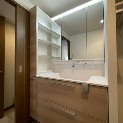 水栓が壁出しになっているので、水あかが付きにくくお掃除がしやすい点からTOTOオクターブをご提案しました。アクセサリー類の一時置きに便利な「ちょい置きカウンター」もあり、身支度をしながらスマホで動画視聴も可能です。また、リフォーム前でしたら手を拭く度に当たってしまい壁紙がボロボロになっていたそうですが、マグネットパネルをご採用いただいたことで解決。水はねにも強く、マグネット式のタオル掛けも使えます。お施主さまからは、内装が変わることによって雰囲気がかなり明るくなった、ストレスだったタオル掛け部分に頑丈なパネルがあるので気持ちが楽になったとの感想をいただきました。