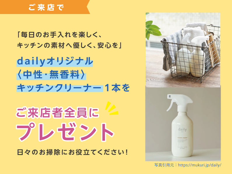 相談会にご予約・ご来場いただいた方全員に、きがえるおススメの [dailyオリジナル キッチンクリーナー] をご用意しています🎁☆