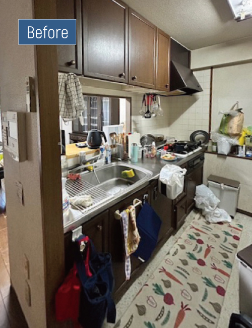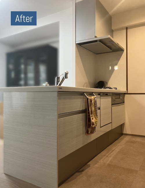 全体的に暗いので、明るく広い空間にしてオープンキッチンにしたい、とのご要望でした。グレージュ木目を好んでいらしたので木目の扉柄が豊富なPanasonicラクシーナをご提案!昔ながらのダークトーンから、流行りのグレージュのトーンに一新し、リフォームを通じて雰囲気をガラッと変えることができお喜びいただきました。