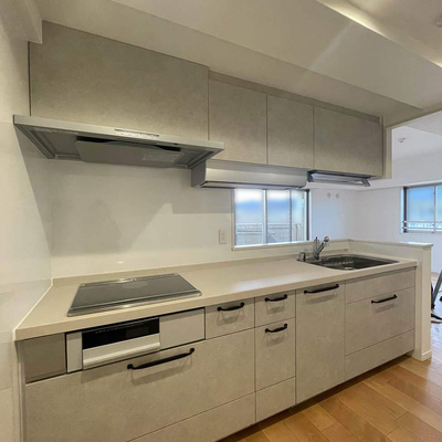 キッチン上部に吊戸棚があり、こもりがちの空間だったため圧迫感にお悩みでした。また開き扉で使い勝手も悪く、モノがどんどん溢れてしまう状況にもお困りでした。グレージュ木目を好んでいらしたので木目の扉柄が豊富なPanasonicラクシーナをご提案。吊戸棚や、周辺壁も解体し、フラット対面をプランニングしました。食洗器をキッチンに組み込み、別接続していた浄水器も水栓一体型商品をご提案し、キッチン全体がスッキリするよう心がけました。