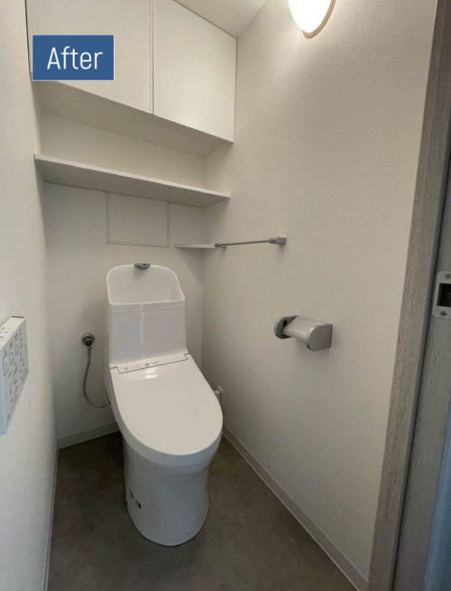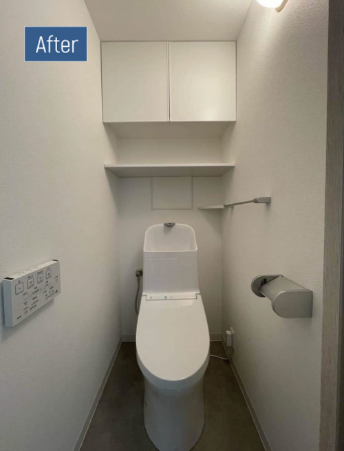 もともとドア上に突っ張り棒で収納を作られていましたが、今回はトイレ背面の収納を壁から壁までの幅で造作し、さらにオープン棚も設置することで、より使いやすく十分な収納力を確保しています。また、ハンドソープを置けるコーナー棚板は、お施主様のこだわりを反映したポイントです。