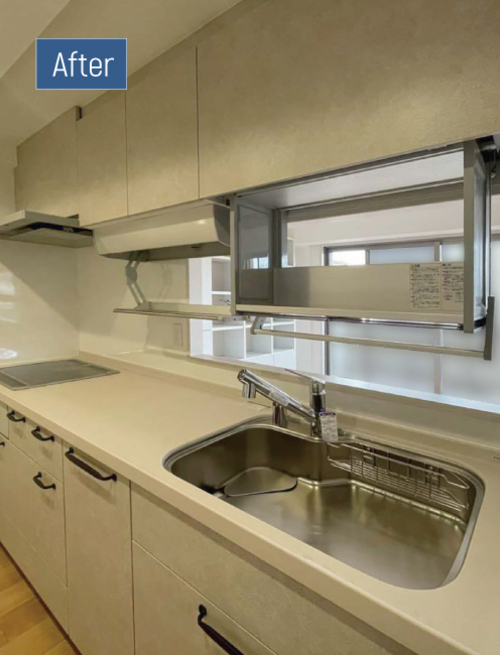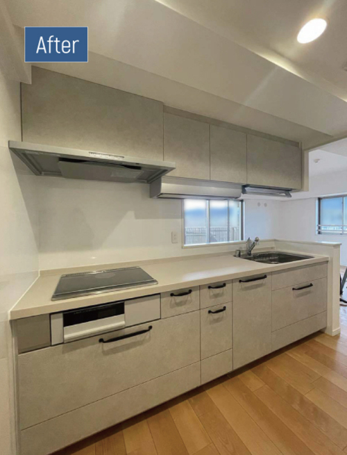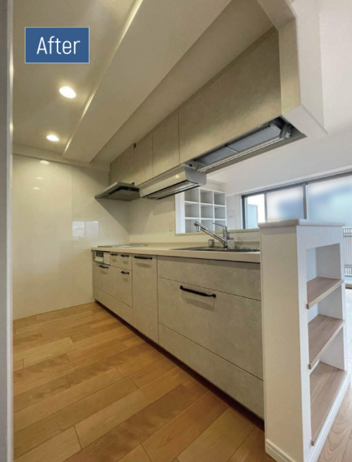 中古マンションの購入をきっかけに、間取り変更を含めて収納力を高め、自分たちの使い勝手に合う住まいへとリフォームを行いました。ナチュラルで北欧風の雰囲気を好まれていたため、そのイメージに合う空間づくりを意識しています。リビングを少しでも広くしたいというご希望からキッチンの位置を調整し、それに伴って腰壁の工事を実施。雑誌や携帯の充電ができるニッチスペースも新たに設けました。さらに、開放感を高めるために吊戸棚の高さを見直し、開口部を大きくしています。キッチンにはハンドムーブやアイエリアボックスを採用し、必要なときにサッと使えるスペースを確保しつつ、使わないときはすっきり片付けられる仕様に。キッチンパネルはマグネット対応とし、キッチンツールを好きな位置に収納できるようにしました。パネルの貼り範囲も広めに設定したことで、調理中に汚れが壁に飛んでも拭き取りやすく、日々の家事がより快適になるキッチンへと生まれ変わりました。