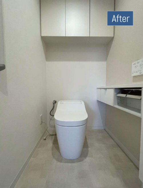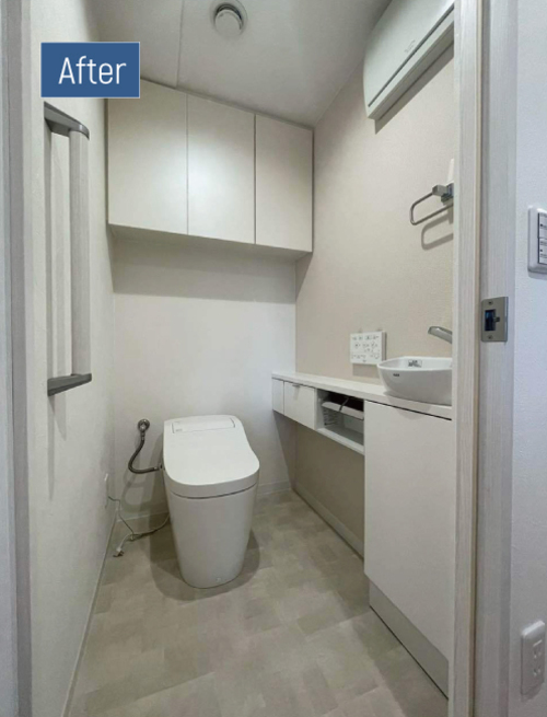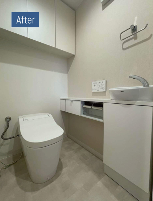 中古マンションの購入をきっかけに、間取り変更を含めて収納力を高め、自分たちの使い勝手に合う住まいへと整えるためにリフォームを行いました。お好みのナチュラル・北欧風のテイストを取り入れ、水回り設備は事前に気になっていた商品をベースに計画しています。凹凸の少ないタンクレストイレへ変更し、お掃除のしやすさが大きく向上しました。中性洗剤の泡で自動洗浄してくれるアラウーノを採用することで、便器内のお手入れも手間いらずに。収納とペーパーホルダーが一体になった手洗いカウンターで空間がすっきり整い、落ち着いた色味の壁紙と合わせて清潔感のあるトイレに生まれ変わりました。